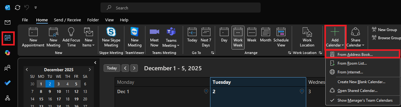 Adding Additional Calendars Aaron Vue December 02, 2025 16:01 Updated In Outlook go to your Calendars tab and click on Add Calendar drop down menu and select From Address Book2. Select a Name or Group and hit OK Comments 0 comments Please sign in to leave a comment.