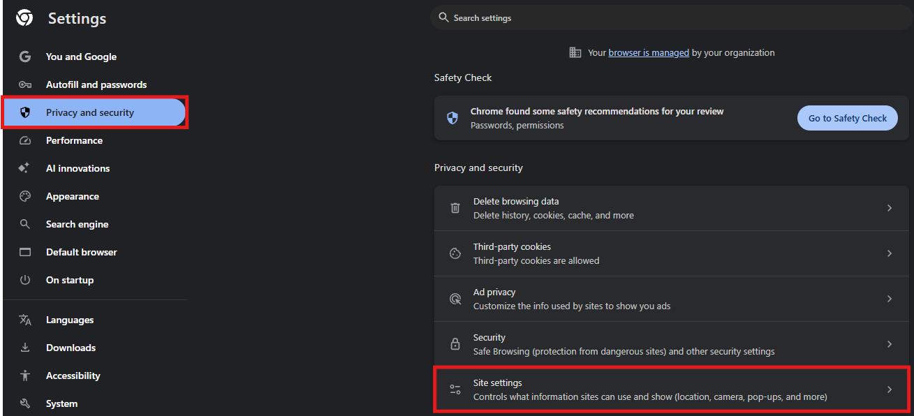 In Privacy and security go into Site settings