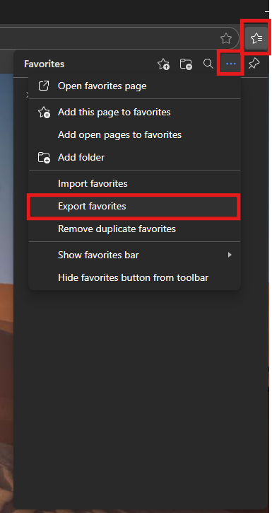 Once inside hit the Ellipsis menu (...) again and hit Export to save your bookmarks or Import to load your bookmarks.