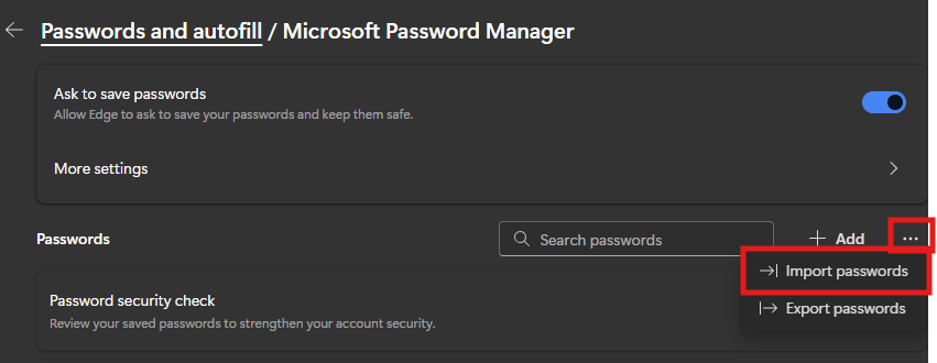 - Now you can follow those same steps above but instead of Exporting Passwords you select Import passwords