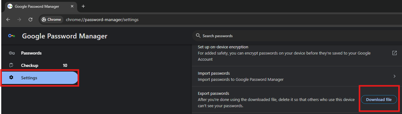 - Once in, click on the Settings page on the far left and then you can download your passwords as an excel file by clicking Export (it will prompt you for your computer pin).