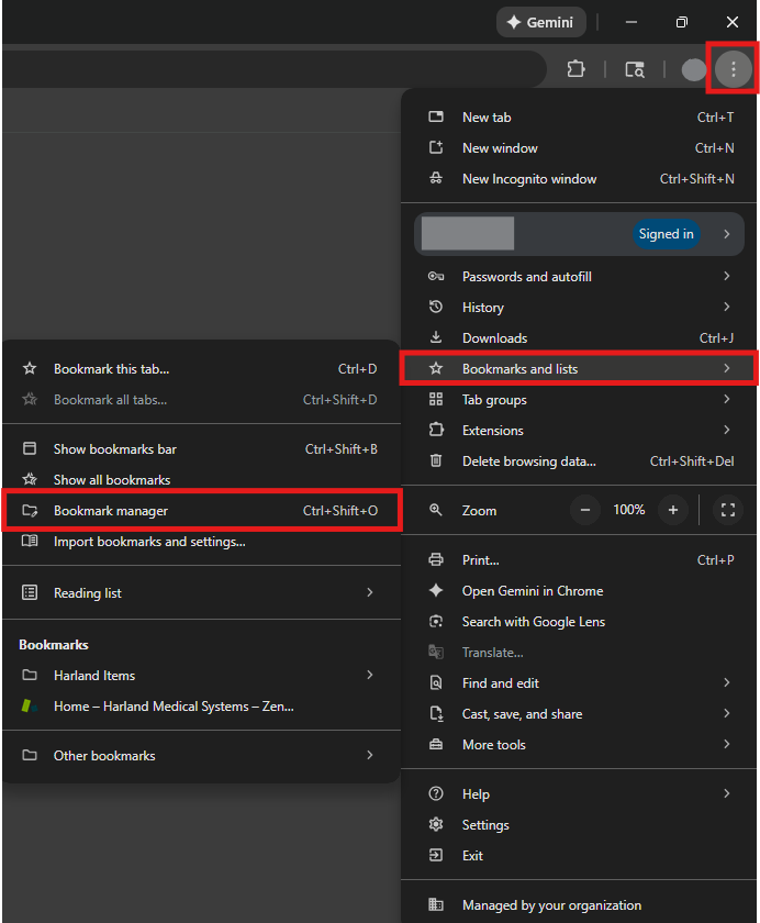 In Chrome, click on the Ellipsis menu (...) then Bookmarks and lists then Bookmark manager
