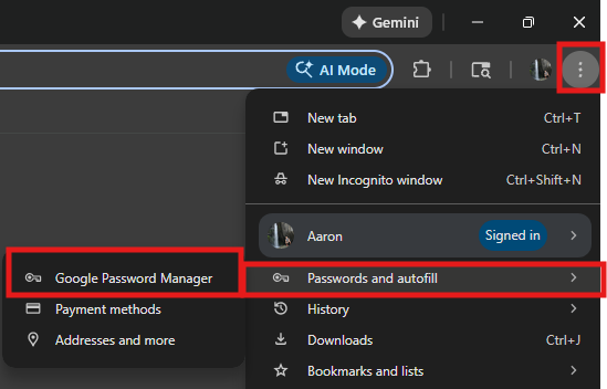 In Chrome, click on the Ellipsis menu (...) then Passwords and autofill and then Google Password Manager