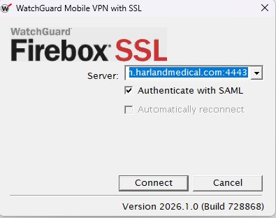 The application should already be pre-populated as shown in the screenshot below. If not, add the server name vpn.harlandmedical.com:4443 and check the box labeled "Authenticate using SAML." Press Connect.