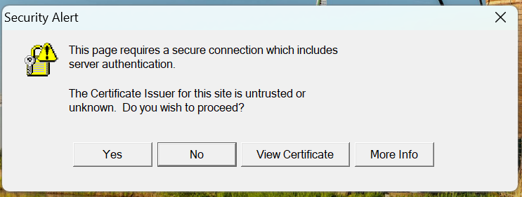 You might receive a one-time Security Alert referring to untrusted Certificate Issuer. Please press Yes.
